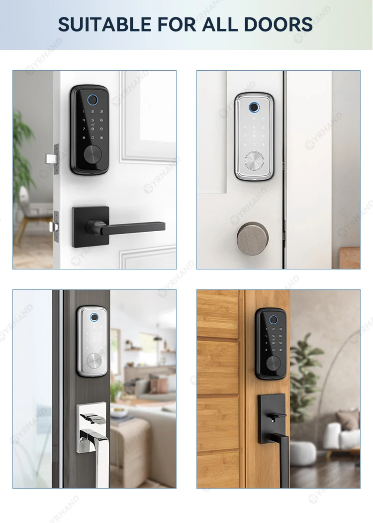 ??5 maneiras de desbloquear o bloqueio de fechadura inteligente?O bloqueio frontal inteligente é desbloqueado/bloqueio por meio do aplicativo Tuya, impressão digital, cartão inteligente, chaves mecânicas ou insira a senha no teclado.Não se preocupe mais em perder ou esquecer suas chaves.Com esta trava de fechadura com teclado, não há necessidade de manter os hóspedes esperando de fora.